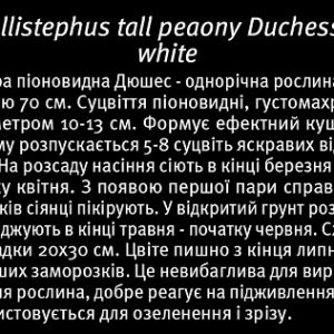 Айтра піоновидна Дюшес — однорічна рослина висотою 70 см. Суцвіття піоновидні, густомахрові, діаметром 10-13 см. Формує ефектний кущ, на якому розпускається 5-8 суцвіть яскравих відтінків. На розсаду насіння сіють в кінці березня — початку квітня. З появою першої пари справжніх листків сіянці пікірують. У відкритий ґрунт розсаду висаджують в кінці травня — початку червня. Схема посадки 20×30 см. Цвіте пишно з кінця липня до перших заморозків. Це невибаглива для вирощування рослина, добре реагує на підживлення. Використовується для озеленення і зрізу.