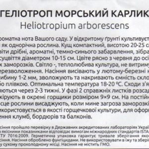 Геліотроп Морський карлик (Heliotropium arborescens). Ароматна нота Вашого саду. У відкритому ґрунті культивується як однорічна рослина. Кущ компактний, висотою 20-25 см. Квіти дрібні, ароматні, темно-синього забарвлення, зібрані у суцвіття діаметром 10-15 см. Цвіте рясно з червня до осінніх заморозків. Світло -, теплолюбива культура, не витримує перезволоження. Насіння висівають у лютому-березні на глибину 1-2 мм, зволожують та накривають ємність склом або плівкою. Оптимальна температура 18-20 °С. Сходи з’являються через 2-3 тижні. У фазі 2 справжніх листків розсаду пікірують в окремі горщики розміром 9×9 см. На постійне місце рослини висаджують, коли мине загроза заморозків. Використовується в якості горщечкової культури, для оформлення клумб, бордюрів та балконів.