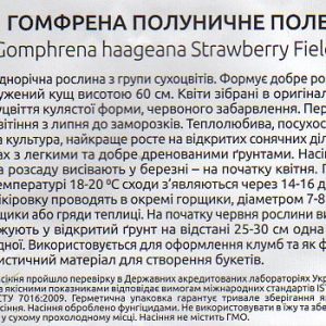 Гомфрена Полуничене поле (Gomphrena haageana Strawberry Fields). Однорічна рослина з групи сухоцвітів. Формує добре розгалужений кущ висотою 60 см. Квіти зібрані в оригінальні суцвіття кулястої форми, червоного забарвлення. Період цвітіння з липня до заморозків. Теплолюбива, посухостійка культура, найкраще росте на відкритих сонячних ділянках з легкими та добре дренованими ґрунтами. Насіння на розсаду висівають у березні – на початку квітня. При температурі 18-20 ⁰С сходи з’являються через 14-16 днів. Пікіровку проводять в окремі горщики, діаметром 7-8 см, ящики або гряди теплиці. На початку червня рослини висаджують у відкритий ґрунт на відстані 25-30 см одна від одної. Використовується для оформлення клумб та як флористичний матеріал для створення букетів.