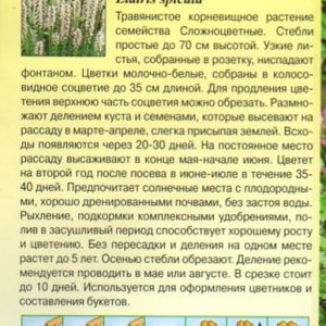 Травянистое корневищное растение семейства Сложноцветные. Стебли простые до 50 см высотой. Узкие листья, собранные в розетку, ниспадают фонтаном. Цветки красно-фиолетовые, собраны в колосовидное соцветие до 35 см длиной. Цветет в июне-июле 35-40 дней. Хорошо растет в солнечном, теплом или жарком месте. Почва умеренно сухая, рыхлая, богатая питательными веществами. На тяжелых, сырых почвах растение гниет. Размножают делением куста и семенами. Сеянцы зацветают на второй год. Лиатрис имеет клубневидные корневища, которые можно легко поделить. Деление рекомендуется проводить каждые 3 года в мае или августе.