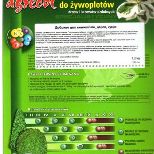 Предназначен для питания любых декоративных деревьев и кустарников, произрастающих в виде живой изгороди, различных садовых фигур, как и растений, медленно растущих. Удобряемые растения легко растут и положительно реагируют на обрезку. Удобрение применять каждые два месяца в период от ранней весны до конца июля в дозе 40 г / 1 м2.