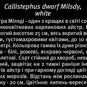 Айстра Міледі — один з кращих у світі сортів великоквіткових карликових айстр. Кущ розлогий висотою 25 см, весь вкритий великими, густо махровими квітами, до 10 см в діаметрі. Кольорова гамма їх дуже різноманітна — білі, рожеві, яскраво-червоні, сині та фіолетові. Сорт стійкий до хвороб, невибагливий, зацвітає на 2 тижні раніше інших сортів айстр і при гарному догляді цвіте до самих морозів. Відстань між рослинами в ящику — 20 см. Цвітіння: липень-вересень.
