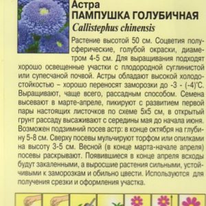 Растение высотой 50 см. Соцветия полусферические, голубой окраски, диаметром 4-5 см. Для выращивания подходят хорошо освещенные участки с плодородной суглинистой или супесчаной почвой. Астры обладают высокой холодостойкостью — хорошо переносят заморозки до -3-4℃. Выращивают чаще всего рассадным способом. Семена высевают в марте-апреле, пикируют с развитием первой пары настоящих листочков по схеме 5×5 см, в открытый грунт рассаду высаживают с середины мая до начала июня. Возможен подзимний посев астр: в конце октября на глубину 5-8 см. Сверху посевы мульчируют торфом или опилками на высоту 3-5 см. Весной (в конце марта-начале апреля) посевы раскрывают. Появившиеся в конце апреля всходы будут закаленными, а выросшие растения сильными, устойчивыми к заморозкам и обильно цвести. Используются для получения срезки и оформления участка.