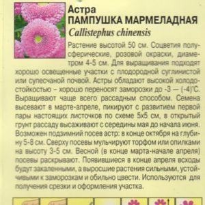 Растение высотой 50 см. Соцветия полусферические, розовой окраски, диаметром 4-5 см. Для выращивания подходят хорошо освещенные участки с плодородной суглинистой или супесчаной почвой. Астры обладают высокой холодостойкостью – хорошо переносят заморозки до -3-4оС. Выращивают чаще всего рассадным способом. Семена высевают в марте-апреле, пикируют с развитием первой пары настоящих листочков по схеме 5х5 см, в открытый грунт рассаду высаживают с середины мая до начала июня. Возможен подзимний посев астр: в конце октября на глубину 5-8 см. Сверху посевы мульчируют торфом или опилками на высоту 3-5 см. Весной (в конце марта-начале апреля) посевы раскрывают. Появившиеся в конце апреля всходы будут закаленными, а выросшие растения сильными, устойчивыми к заморозкам и обильно цвести. Используются для получения срезки и оформления участка.