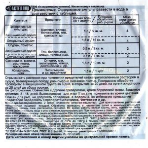 Содержимое ампулы актеллик 2 мл хватает развести 2 л. воды. Налить 0,1 л. воды в стеклянную банку, вылить содержимое ампулы и тщательно перемешать, затем довести рабочий раствор до требуемого объёма. Скорость действия препарата наступает в интервале от нескольких минут до нескольких часов.