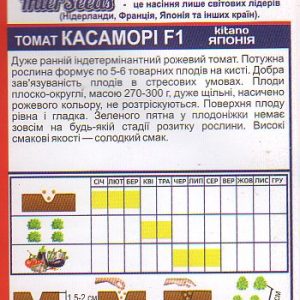 Касамори F1 семена томата индетерминантного розового (Kitano Seeds). Срок созревания 95 — 105 дней. Качественный, стабильный, урожайный гибрид для первого оборота в теплицах из пленки. Индетерминантный ультраранний томат. Растение мощное, компактное, с коротким расстоянием между узлами, способно формировать по 5-6 товарных плодов на кисти. Помидоры очень плотные, плоскоокруглые, насыщенно-розовые, средним весом 300-320 грамм (могут достигать 500-550). Преимущества Касамори F1: отсутствие прозелени у плодоножки; устойчивость к теплоперепадам; высокие вкусовые показатели и сахарный вкус; обильное плодоношение даже в стрессовых условиях.