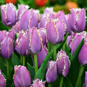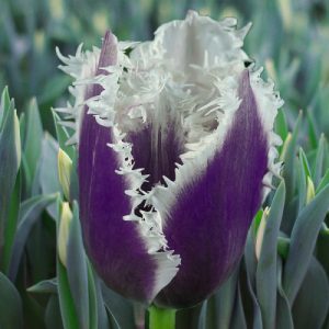 Тюльпан бахромчатий Cummins (Каммінс) лавандово-фіолетового забарвлення пелюсток з білої голчастою бахромою по краях, що нагадує легку паморозь, не залишить Вас байдужим. Неповторний своєю формою квітки, тому що неможливо зустріти двох однакових суцвіть цієї рослини. Прекрасно тримає форму навіть в найспекотніші дні. Буде прекрасним доповненням в ландшафтному дизайні і прикрасою клумб.