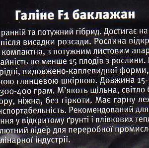 Дуже ранній та потужний гібрид. Достигає на 60-65 день після висадки розсади. Рослина відкритого типу, компактна, з потужним листовим апаратом. Урожайність не менше 15 плодів з рослини. Плоди однорідні, видовжено-каплевидної форми, з гладенькою глянцевою шкіркою. Довжина 15-18 см, вага 300-400 грам. М’якуш щільний, світло білого кольору, ніжна, без гіркоти. Має гарну лежкість і транспортабельність. Рекомендований для вирощування у відкритому ґрунті та плівкових теплицях. Абсолютний лідер для переробної промисловості та кулінарної індустрії.