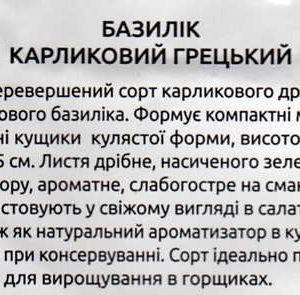 Неперевершений сорт карликового дрібно-листового базиліка. Формує компактні мініатюрні кущики кулястої форми, висотою до 30-35 см. Листя дрібне, насиченого зеленого кольору, ароматне, слабогостре на смак. Використовують у свіжому вигляді в салатах, а також як натуральний ароматизатор в кулінарії та при консервуванні. Сорт ідеально підходить для вирощування в горщиках.