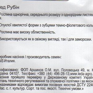 Ред Рубін насіння базиліка — сорт середньоранній. Від повних сходів до технічної стиглості 34-40 днів. Рослина заввишки понад 30 см, компактна. Листки видовжено-яйцевидні, фіолетово-червоного кольору, опуклі, гладкі або слабо пухирчасті, черешок середньої довжини. Стебло темно-фіолетове. Маса однієї рослини від 120 грам. Аромат сильний зі специфічним «гвоздиковим» присмаком.