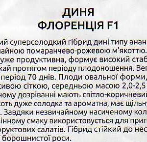 Новий суперсолодкий гібрид дині типу ананас з незвичайною помаранчево-рожевою м’якоттю. Рослина дуже продуктивна, формує високий стабільний урожай протягом всього періоду плодоношення. Вегетаційний період 70 днів. Плоди овальної форми, вкриті красивою сіткою, середньою масою 2,0-2,5 кг, при повному дозріванні мають світло-коричневий колір. М’якоть дуже солодка та ароматна, має щільну структуру. Завдяки незвичайному насиченому кольору та відмінному смаку використовується для приготування фруктових салатів. Гібрид стійкий до несправжньої борошнистої роси.