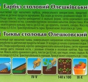 Середньостиглий сорт мускатного гарбуза, універсального використання, придатний для переробки на дієтичні продукти харчування. Від сходів до початку дозрівання плодів 100 — 110 днів. Плоди кулястої, коротко циліндричної й овальної форми, світло-коричневого кольору іноді кольору слонової кістки, з рожевим відтінком і восковим нальотом. Шкірка тонка. М’якоть жовто-жовтогарячого кольору, товста ( до 8,0 см.), що хрумтить, соковита, солодка. Маса середнього плода 6,0-8,0 кг. Транспортабельність гарна. Врожай може зберігатися до 1 року.