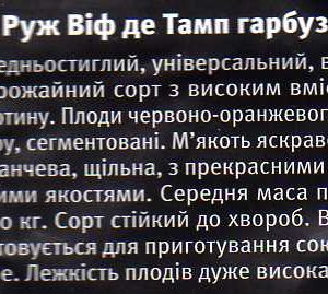 Середньостиглий, універсальний, високоврожайний сорт з високим вмістом каротину. Плоди червоно-оранжевого кольору, сегментовані. М’якуш яскраво-помаранчевий, щільний, з прекрасними смаковими якостями. Середня маса плоду 15-20 кг. Сорт стійкий до хвороб. Використовується для приготування соків та пюре. Лежкість плодів дуже висока.