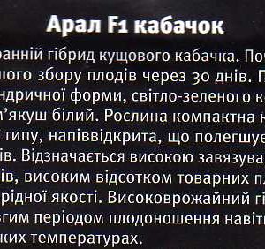 Надранній гібрид кущового кабачка. Початок першого збору плодів через 30 днів. Плоди циліндричної форми, світло-зеленого кольору, м’якуш білий. Рослина компактна кущового типу, напіввідкрита, що полегшує збір плодів. Відзначається високою завязуваністю плодів, високим відсотком товарних плодів однорідної якості. Високоврожайний гібрид з довгим періодом плодоношення навіть при низьких температурах.