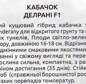Новий кущовий гібрид кабачка типу Eskanderany для відкритого грунту та плівкових тунелів. Плоди світло-зеленого кольору, довжиною 16-18 см. Відрізняються відмінними смаковими якостями при вживанні у свіжому вигляді та переробці. Рослина сильна, компактна, з раннім терміном достинання (35 днів). Стійка до хвороб (справжньої борошнистої роси) та до різких перепадів температур.