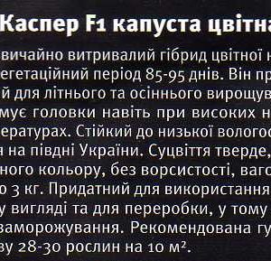 Надзвичайно витривалий гібрид цвітної капусти. Вегетаційний період 85-95 днів. Він призначений для літнього та осіннього вирощування. Формує головки навіть при високих нічних температурах. Стійкий до низької вологості повітря на півдні України. Суцвіття тверде, білосніжного кольору, без ворсистості, вагою від 1,5 до 3 кг. Придатний для використання у свіжому вигляді та для переробки, у тому числі для заморожування. Рекомендована густота посіву 28-30 рослин на 10 м².