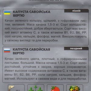 Пізній сорт. Качан зеленого кольору, щільний, з гофрованим листям, великий. Маса качана – 1,5–3 кг. Сорт холодостійкий, посухостійкий, добре зберігається. Сорт має високий вміст вітаміну С, а також вітаміни В1, В2, В6, РР, солі натрію, кальцію, фосфор, магній. Використовують у свіжому вигляді та для переробки.