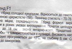Надійний гібрид суперсолодкої кукурудзи з раннім терміном достигання . Головна відмінність гібриду — підвищена кількість цукрів, здатність до довготривалого зберігання після збору. Довжина качанів 21 см. Рослина міцна, на стеблі формується мінімум два качани. Використовується для переробки, консервування, та свіжого вживання.