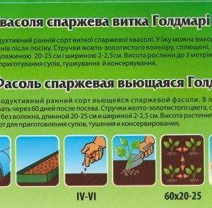Дуже продуктивний ранній сорт виткої спаржевої квасолі. У їжу можна використовувати через 60 днів після посіву. Стручки жовто-золотистого кольору, сплющені, м’ясисті, без волокна, довжиною 20-25 см і шириною 2-2,5 см. Висота рослини до 3 метрів. Використовують для приготування супів, тушкування й консервування.