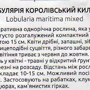 Лобулярія морська Королівський килим (Lobuiaria maritima mixed). Декоративна однорічна рослина, яка утворює густо розгалужений компактний кущ, висотою 15 см. Квіти дрібні, запашні, зібрані в китицеподібні суцвіття, різного забарвлення. Цвітіння триває з червня до жовтня. Висівають у квітні — травні у відкритий ґрунт або у березні на розсаду. Відстань між рослинами складає 10-15 см. Можливий посів під зиму. Застосовують на рабатках, клумбах, бордюрах, кам’янистих гірках.