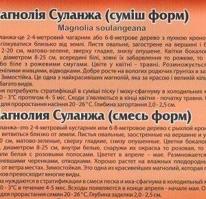 Магнолія Суланжа — це 2-4-метровий чагарник або 6-8-метрове дерево з пухкою кроною, зазвичай починаючої гілкуватися близько від землі. Листя овальне, загострене на вершині і біля основи, довжиною 12-20 см, матово-зелене, зверху гладке, знизу опушене. Квітки бокалоподібні або чашоподібні, діаметром 8-25 см, всередині — білі, зовні їх забарвленя то рожеве, то червоне, то пурпурне або біле з рожевими смугами. Цвіте у квітні — травні. Розмножується насінням, напівздеревнілими живцями відводками. Добре росте на вологих родючих ґрунтах в захищених від вітру місцях. Зимостійка. Це одна з найкрасивіших магнолій.