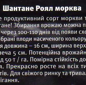 Морковь Шантане Роял 2 г – Очень продуктивный сорт моркови по типу Шантане. Начало сбора урожая можно начинать уже после 100-110 дней после появления всходов. Плоды имеют насыщенный, что не на есть морковный цвет. Длина их составляет 16 см, ширина верхнего плеча 5 см. Урожайность на столько высокая и достигает 50 тонн на 1 гектар. Умеренная стойкость к цветению. Отлична подходит для выращивания на всех типах грунтов. Долго хранится.