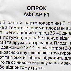 Новий ранній парненокарпічний гібрид огірка з темно-зеленими плодами високої якості. Вегетаційний період 35-40 днів. Рослина потужна, що забезпечує відмінний урожай та дружнє дозрівання. Плоди вирівняні, довжиною 12-14 см, діаметром 3-3,5 см, з прекрасною внутрішньою структурою, без пустот та гіркоти. Гібрид підходить для весняного та осіннього вирощування у закритому або відкритому грунті.