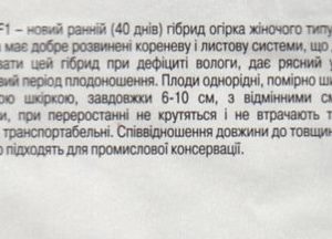 Ранній ранньостиглий, тривалість огірка, переважно жіночого типу цвітіння.