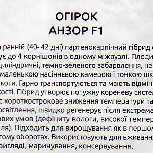 Ультра ранній (40 42 дня) партенокарпічний гібрид огірка. Формує до 4 корнішонів в одному межвузлі. Плоди однорідні, циліндричні, темно-зеленого забарвлення, не жовтіють, з маленькою насіннєвою камерою і тонкою шкіркою, без гіркоти. Добре транспортуються і мають відмінні смакові якості.