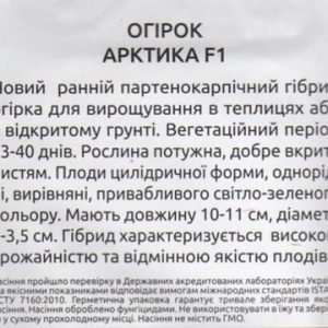 Огірок Арктика є досить раннім з партенокарпічних (самозапильних) гібридом огірка. Вирощується як в теплицях, так і у відкритому грунті. Вегетаційний період становить 33-40 днів. Рослина досить потужна, рясно вкрите листям. Відстань між пазухами досить маленьке, з кожної пазухи формує по два-три плоди, які визрівають без проблем.