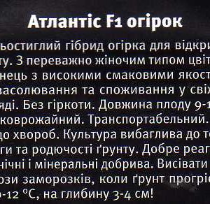 Ранньостиглий гібрид огірка для відкритого ґрунту. З переважно жіночим типом цвітіння. Зеленець з високими смаковими якостями, для засолювання та споживання у свіжому вигляді. Без гіркоти. Довжина плоду 9-11 см. Високоврожайний. Транспортабельний. Стійкий до хвороб. Культура вибаглива до тепла, вологи та родючості ґрунту. Добре реагує на органічні й мінеральні добрива. Висівати після загрози заморозків, коли ґрунт прогріється до 10-12°C, на глибину 3-4 см!