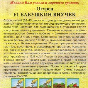 Насіння огірків Бабусин Внучок F1 — скороспелий (38-43 днів від сходів до плодоношення) партенокарпічній гібрид в основном жіночого типу Цвітіння для вирощування у відкрітому грунті и під плівковімі укриття. Рослина потужного, с ограниченной зростанням бічніх пагонів и букетний Закладення Зав’язь, до 2-4 шт. на сайті. Корнішоні Короткі, ціліндрічної форми, масою 110-120 г, темно-зелені, среднебугорчатие. Плоди прекрасного смаку, Щільні, хрусткі, з освіжаючім ароматом. Ідеальні для свіжіх салатів, засолювання и консервування.Гібрид Стійкий до кладоспоріозу, борошністої роси та кореневої гнілізні. Врожайність 12,8 кг / м ?. Посів на розсаду проводять в кінці квітня — качана травня. Вісадження в грунт в кінці травня — качана червня у фазі двох-трьох справжніх листків під Тимчасові плівкові Укриття. Посів у Відкритий грунт проводитися в кінці травня — на качану червня. Схема посадки: 50х50 см. Оптимальна для проростання насіння температура грунту 25-30 ° C.