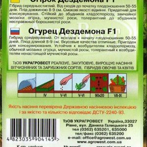 Гібрид середньостиглий. Від сходів до початку плодоношення 50-55 днів. Плід довжиною 8-9 см. Смакові якості відмінні. Придатний для консервування. Стійкий до збудників кладоспоріозу, звичайної мозаїки огірка, мучнистої роси, толерантний до збудників несправжньої борошнистої роси.