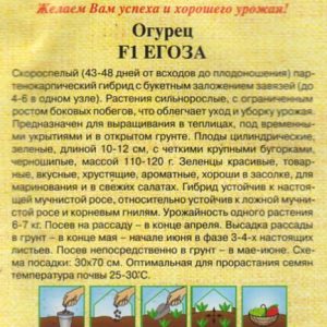 Скороспелый (43-48 дней от всходов до плодоношения) партенокарпический гибрид с букетным заложением завязей (до 4-6 в одном узле). Растения сильнорослые, с ограниченным ростом боковых побегов, что облегчает уход и уборку урожая. Предназначен для выращивания в теплицах, под временными укрытиями и в открытом грунте. Посев на рассаду в конце апреля. Высадка рассады в грунт в конце мая – начале июня в фазе 3-4-х настоящих листьев. Посев непосредственно в грунт – в мае – июне. Схема посадки 30х70 см. Плоды цилиндрические, зеленые, длиной 10-12 см, с четкими, крупными бугорками, черношипые, массой 110-120 г. Зеленцы красивые, товарные, вкусные, хрустящие, ароматные, хороши в засолке, мариновании и свежих салатах. Гибрид устойчив к настоящей мучнистой росе, относительно устойчив к ложной мучнистой росе и корневым гнилям. Урожайность одного растения 6-7 кг