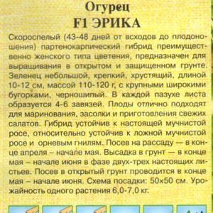 Гібрид огірка Еріка F1 був включений до Державного реєстру Російської Федерації. Сорт призначений спеціально для вирощування на невеликих ЛПГ під плівковими укриттями. Сорт універсальний його можна використовувати для консервації в банки, солити, вживати в свіжому вигляді і різних салатах. Ранньостиглий. Плодоношення настає на 40-45 день після масових сходів.