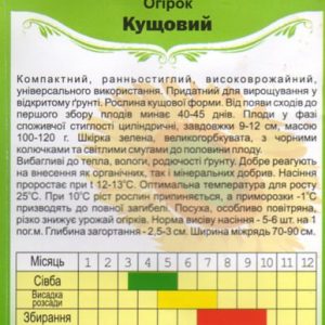 Скоростиглий, компактний, високоврожайний, універсального використання. Для вирощування у відкритому грунті. Довжина плоду 9-12 см, маса — 100-120 г, врожайність 10-12 кг / м2. Шкірочка зелена з чорними грудочками і світлими смугами до половини плоду.
