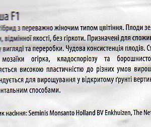 Ранній від 40 до 45 днів, перевірений роками, комахозапильний гібрид з переважно жіночим типом цвітіння. Огірочки яскраві, світло-зелені, помірно шиповані, відмінної якості, без гіркоти, дуже смачні. Гарна щільність і консистенція. Вирізняється високою пластичністю до різноманітних умов вирощування. Гібрид Наташа F1 постійно радує городників відмінним урожаєм. Його використовують як для вживання у свіжому вигляді та для переробки. Рекомендується для вирощування у плівкових теплицях, а також у відкритому ґрунті вертикальним і горизонтальним засобами. Висівати після загрози заморозків, коли ґрунт прогріється до 10-12°C, на глибину 3-4 см!