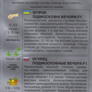 Партенокарпічний, салатний, консервний. В плодоношення вступає на 42-45 день після повних сходів. Рослина індетермінантна, сильноросла, переважно жіночого типу цвітіння, число жіночих квіток у вузлі 1-3. Лист темно-зелений, зморшкуватий, по краю рівний або слабохвилястий. Зеленець циліндричний, темно-зелений, горбкуватий (горбки рідкісні), опушення біле. Довжина зеленця 12-14 см, діаметр 3,5-4,5. Маса зеленця 80-110 г, смакові якості відмінні. Товарна врожайність 15-17 кг / кв.м. Стійкий до вірусу огіркової мозаїки, кладоспоріозу, борошнистої роси, толерантний до несправжньої борошнистої роси. Цінність гібрида: ранньостиглість, схильність до пучкового утворення зав’язей, тривала віддача врожаю, придатність до консервації, стійкість до хвороб, висока якість плодів, тіньовитривалість.