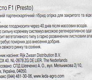 Престо F1 — ранній партенокарпічний гібрид огірка для закритого та відкритого грунту. Починає плодоносити через 40 днів після масових сходів. Має сильну кореневу систему з високою регенераційною здатністю. Гібрид вегетативного типу з добре розвиненим листовим апаратом. Вимагає помірних доз внесення добрив. Придатний для соління та для свіжого ринку.