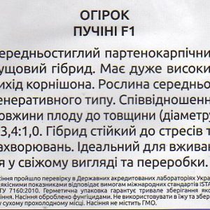 Пуччіні F1 — середньостиглий самозапилюватися кущовий гібрид огірка. Має дуже високий вихід корнішона. Рослина середньо генеративного типу. Співвідношення довжини плоду до товщини (діаметра) — 3,4: 1,0. Стійкий до стресів і захворювань. Ідеальний для вживання в свіжому вигляді і переробки! Висівати після загрози заморозків, коли грунт прогріється до 10-12 ° С, на глибину 3-4 см!