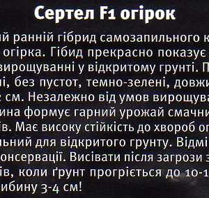 Новий ранній гібрид самозапильного кущового огірка. Гібрид прекрасно показує себе при вирощуванні у відкритому ґрунті. Плоди якісні, без пустот, темно-зелені, довжиною 10-12 см. Незалежно від умов вирощування, рослина формує гарний урожай смачних зеленців. Має високу стійкість до хвороб огірка. Ідеальний для відкритого ґрунту. Відмінний для консервації. Висівати після загрози заморозків, коли ґрунт прогріється до 10-12°C, на глибину 3-4 см!