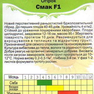 Середньоранній високоврожайний гібрид для відкритого грунту. До плодоношення 42-45, період плодоношення 45-50 днів. Плоди циліндричні з горбкуватою поверхнею.Смакові якості добрі. Плоди використовуються свіжими, консервованими і засоленими. Гібрид стійкий до хвороб. Не потребує інтенсивного хімічного захисту.