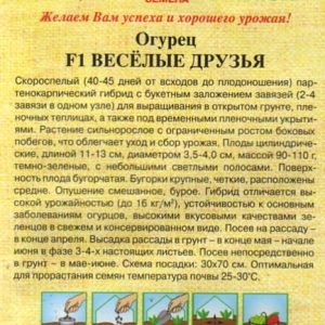Скоростиглий (40-45 днів від сходів до плодоношення) партенокарпічний гібрид з букетним закладенням зав’язей (2-4 зав’язі в одному вузлі) для вирощування в плівкових теплицях, а також під тимчасовими плівковими укриттями. Рослина сильноросла з обмеженим ростом бічних пагонів, що полегшує догляд і збір урожаю. Плоди циліндричні, довжиною 11-13 см, діаметром 3,5-4,0 см, масою 90-110 г, темно-зелені, з невеликими світлими смугами. Поверхня плоду мілкобугриста. Опушення змішане, біле. Гібрид відрізняється високою врожайністю (до 16 кг/м2), стійкістю до основних захворювань огірків, високими смаковими якостями зеленців в свіжому і консервованому вигляді. Посів на розсаду — наприкінці квітня. Висадка розсади в грунт — наприкінці травня — початку червня у фазі 3-4-х справжніх листків. Посів безпосередньо в грунт — в травні — червні. Схема посадки: 30х70 см.