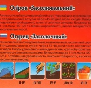 Ранньостиглий високоврожайний сорт. Чудовий для засолювання. У плодоношення вступає через 45-48 днів після сходів. Плоди подовжено-циліндричні, зелені зі світлими смугами. Довжина до 11 см, маса 100-125 г. Стабільна врожайність, висока товарність та засолювальні якості.