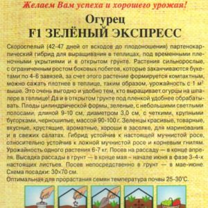 Скоростиглий (42-47 днів від сходів до плодоношення) партенокарпічний гібрид для вирощування в теплицях, під тимчасовими плівковими укриттями і у відкритому грунті. Рослини сильнорослі, з обмеженим ростом бічних пагонів, які закінчуються букетами по 4-6 зав’язі, за рахунок цього рослина формується компактним, можна садити щільніше в теплиці, таким чином, урожайність з 1 м ² вище. Це дуже вигідно і зручно тим, хто вирощує огірки на шпалері в теплиці! Та й у відкритому грунті під плівкою зручніше обробляти.