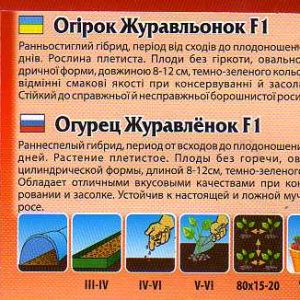 Ранньостиглий гібрид, період від сходів до плодоношення 42-45 днів. Рослина плетиста. Плоди без гіркоти, овально-циліндричної форми, довжиною 8-12 см, темно-зеленого кольору. Має відмінні смакові якості при консервуванні й засолюванні. Стійкий до справжньої й несправжньої борошнистої роси.