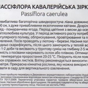 Пассифлора Кавалерийская звезда (Passiflora caerulea). Неприхотливая многолетняя быстрорастущее лиана длиной 300 см, с очень привлекательными экзотическими цветами. Созревший плод — оранжевая ягода. Период цветения с весны до осени. Светолюбивое культура. В период активного роста нуждается в регулярном поливе, опрыскивания, проветривание и подкормки. Посев проводят в феврале — марте. Семена предварительно скарификують, после этого замачивают в теплой воде на 1-2 суток и высевают в почвенную смесь на глубину 2-5 мм. Емкость с посевами накрывают стеклом или пленкой. Оптимальная температура прорастания 20-25 ° С. Пикируют после появления двух настоящих листьев. Летом рекомендуется выносить на воздух. Прекрасная комнатное растение, которое можно использовать в саду для вертикального озеленения.