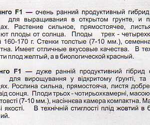 Дуже ранній продуктивний гібрид солодкого перцю, для вирощування у відкритому ґрунті, та плівкових теплицях. Рослина сильна, прямостояча, листя добре закриває плоди від сонця. Плоди трьох — чотирьохкамерні, масою 160-170 г. Стінки товсті (7-10 мм), насіннєва камера компактна. Має відмінні смакові якості. В технічній стиглості плід жовтий в біологічній червоний.