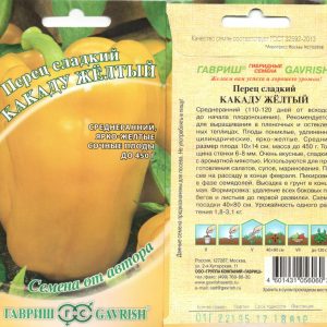 Среднеранний (110-120 дней от всходов до начала плодоношения). Рекомендуется для выращивания в пленочных и остекленных теплицах. Плоды пониклые, удлиненно-цилиндрические, ярко-желтые. Средний размер плода 10х14 см, масса до 450 г. Толщина стенки 6-8 мм. Очень вкусные, сладкие, с ароматной мякотью. Используются для приготовления салатов, супов, маринования. Посев на рассаду в конце февраля. Пикировка в фазе семядолей. Высадка в грунт в конце мая. Формировка: удаление всех боковых побегов и листьев до первой развилки. Схема посадки 40×80 см. Урожайность одного растения 1,8-3,1 кг/раст.