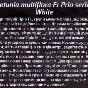 Петуния Прио F1 белая 0,01 г – это гибрид петунии, с большим количеством небольших цветов, относится к группе мультифлора. Неприхотливая в уходе, а также устойчива к ветру, дождям и низкой температуре. Петуния рано зацветает, и напоминает сплошной ковер из белых шариков. Высота растения достигает до 25-30 см, а цветок в диаметре 5-6 см. Семена высевают в феврале-марте, в легкий грунт (торфяные таблетки) и накрывают стеклом или в мини теплицах. Благоприятная температура для всхожести семян 20-22 градуса, в хорошо освещенном месте. Семена прорастают на 7-12 дней, а период цветения начинается на 70-75 день от дня посева. Высаживать в грунт можно в мае, когда минует угроза приморозков.
